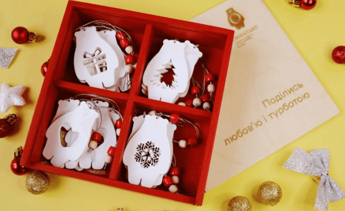 Компанія «Зробив тато» оголосила акцію «Поділись любов’ю і турботою – допоможи Львівському «Охматдиту». Якщо ви купуєте унікальні набори ялинкових прикрас-ведмедиків, 50% коштів з кожного набору підуть на потреби лікарні. 8 таких іграшок в полотняному мішечку коштують 220 грн, а 16 іграшок в дерев’яній коробці – 420 грн. Ціна за один дерев’яний виріб в майстерні становить 25 грн, а за набір – стартує від 165 грн.