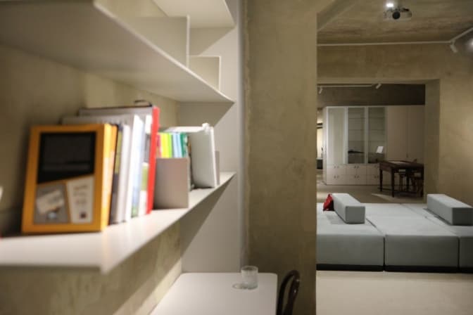 У нас є 260 квадратних метрів простору. Галерея займає майже 100 квадратів. При вході одразу починається лекторій. Коли немає лекцій, дискусій, обговорень, майстер-класів, то це простір для відпочинку і роботи. Одразу за імпровізованою сценою є медіатека. Тут можна погортати книги, послухати вініли. Є кухня відкритого типу, можна випити кави, почитати.