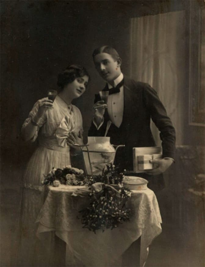 Фото: photo-lviv.in.ua Пара з келихами в руках, біля накритого столу, оздобленого омелою, чоловік з подарунками. Фото 1900-1920 років.