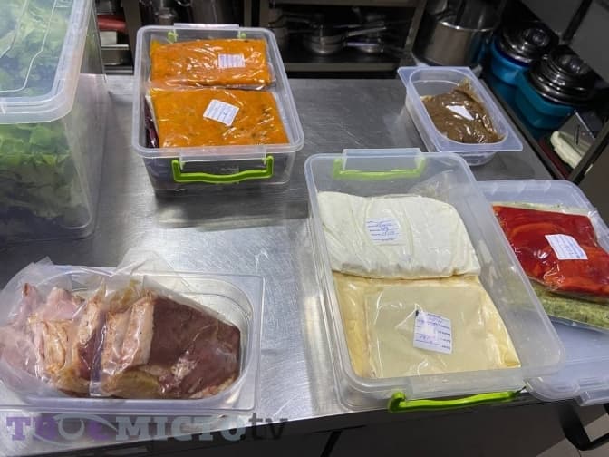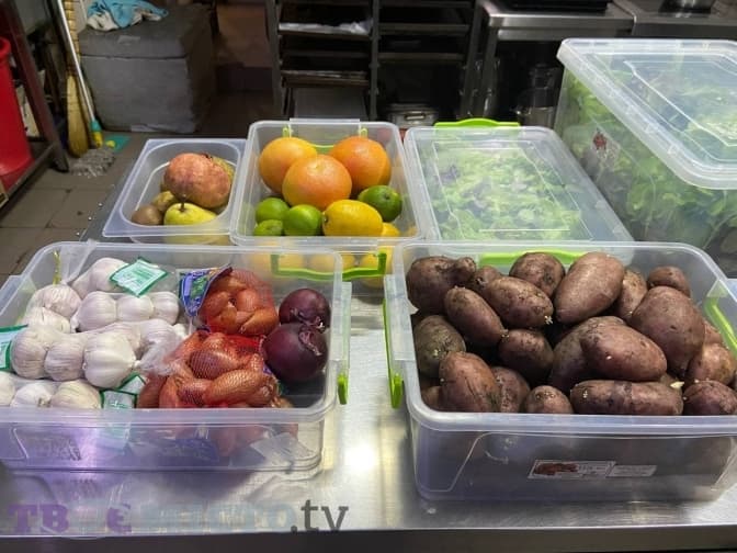 Загалом кухня у закладі невеличка, багато продуктів зберігати нема можливості: купили, приготували і продали. А викидати – дорого. Пані Катерина показує фрукти, овочі і салат. Решта продуктів, як от м’ясо, є завакуумовані, що не дозволить їм зіпсуватися.