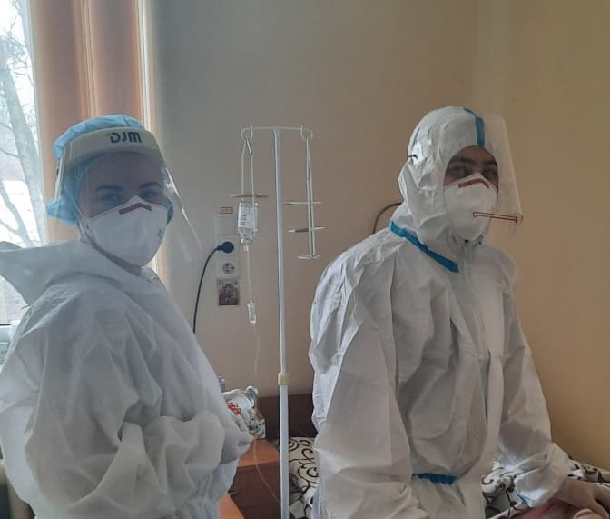 Також у відділенні працюють медсестрами і медбратами студенти медичного університету. Завідувачка розповідає, що частина медсестер старшого віку звільнилась – не могли працювати у такому режимі або боялись інфікуватись. Тоді прийшли студенти і попросились допомагати. Хтось мав потрібні навички, хтось – ні, але тепер всі навчились і працюють.