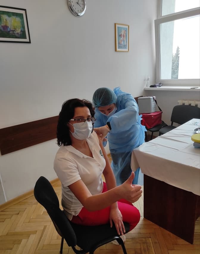 Епідеміологиня Західноукраїнського спеціалізованого дитячого медцентру Оксана Пушкарьова разом із колегами також вакцинувалась у понеділок. До них у лікарню приїжджала мобільна бригада.