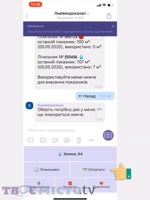 Подати показники лічильників, оплатити рахунки за послуги водопостачання та водовідведення, отримувати інформацію про нарахування та можливі технічні роботи на водопровідній мережі можна в одному місці – у додатках Viber або Telegram. Тут працює зручний, а головне простий і зрозумілий чат-бот. Він, до речі, може спілкуватися двома мовами – українською та англійською.