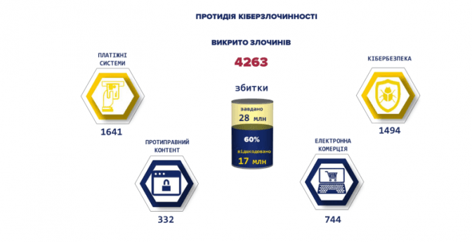 Станом на кінець 2019 року правоохоронці викрили понад 4 тисячі злочинів, що завдали збитків на 28 млн грн. 60%, за даними Кіберполіції України, потерпілим відшкодували. Найчастіше злочини були пов’язані з платіжними системами (1641), а найменше – з протиправним контентом (332).