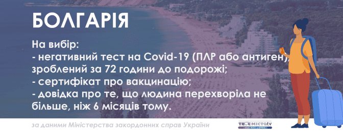 Ця країна відкрила кордони для іноземних туристів із 1 травня, однак лише для тих, хто має один з трьох обов’язкових документів для в’їзду: сертифікат про вакцинацію від коронавірусу, негативний ПЛР-тест або тест на антиген (потрібен також дітям), або документ про те, що людина перехворіла на Covid-19. Важливо, що останній документ має датуватися числом не раніше, ніж за 6 місяців до дати в’їзду в Болгарію.