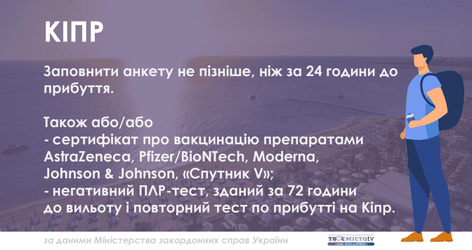 Туристи, у тому числі українці, зможуть в’їжджати до Кіпру без обов'язкової самоізоляції чи тесту на коронавірус, якщо вони повністю вакцинувалися від Covid-19 схваленими в ЄС препаратами (AstraZeneca, Pfizer/BioNTech, Moderna, Johnson & Johnson) або «Спутником V».
