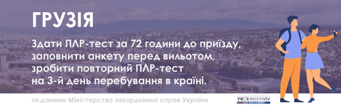 Протягом 72 годин до подорожі в Грузію потрібно зробити ПЛР-тест, у тому числі і дітям, негативний результат якого надати на прикордонному пункті в Грузії. Перед перетином кордону також необхідно заповнити спеціальну анкету, вказавши історію поїздок за останні 14 днів, контактні дані (адреса, номер телефону, адреса електронної пошти тощо).