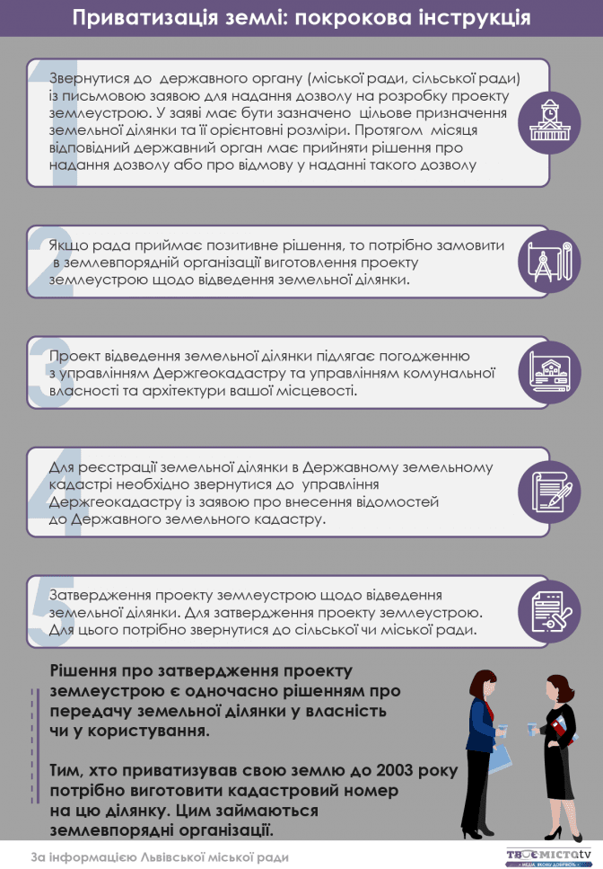 У відео на YouTube каналі «Твоє Місто» голова львівського обласного осередку «Асоціації фахівців землеустрою України» Олег Пірус розповідає, як можна отримати землю у власність, чи реально отримати ділянку безкоштовно, та що таке кадастровий номер.