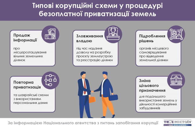 На початку 2021 року Національне агентство з питань запобігання корупції (НАЗК) опублікувало дослідження, у якому викриває найбільш розповсюджені корупційні схеми у земельній сфері.