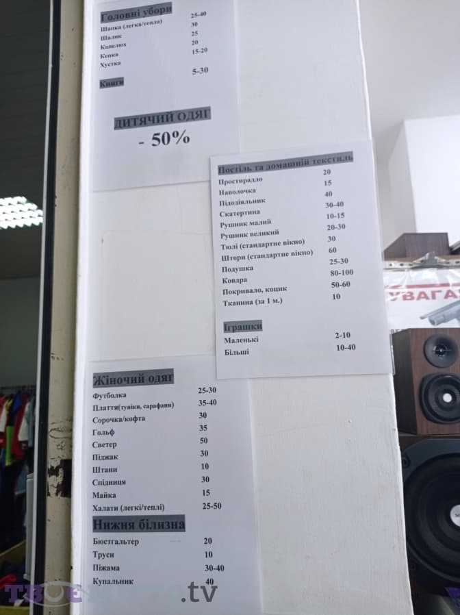 Цін тут немає, лише добровільна пожертва. Проте є рекомендовані ціни. Наприклад, у першому відділі за футболку просять заплатити 50 грн, за светер – 70-80 грн. Взуття – від 120 грн. У другому відділі футболка коштуватиме 25-30 грн, майка – 15 грн, простирадло – 20 грн, ковдра – 80-100 грн.