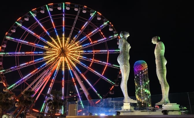 Притягальний магніт бульвару і головний символ Батумі – скульптура Алі та Ніно. Це найсумніша лавсторі усього Кавказу. Сто років тому азербайджанський поет і грузинська князівна покохали одне одного і навіть одружилися, незважаючи на всі національні й релігійні бар’єри. Але потім прийшли більшовики і все зруйнували. Алі загинув, захищаючи рідний край. Слід Ніно загубився у Тбілісі. У 2016 році Азербайджан зняв про цю історію мальовничу мелодраму (можна знайти в інтернеті). А в Батумі у 2010-му відкрили скульптурну інтерпретацію. Дві стилізовані фігури, по 8 метрів заввишки, повільно рухаються одна назустріч одній. Раз у 10 хвилин здається, що вони нарешті возз’єдналися, але ні – підступна механіка знову розводить їх у різні боки. Цей витвір Грузія якось експонувала на Венеційському бієнале. А зараз він вабить гостей Батумі. Особливо увечері, коли сонце сідає за море і вмикається підсвітка.