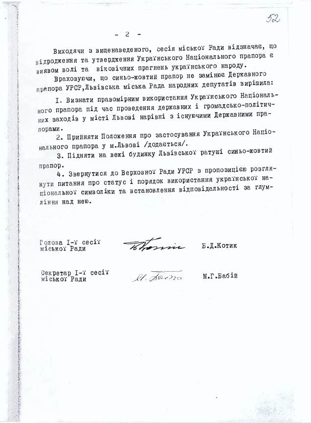 «Не можна було механічно писати, що ми піднімаємо прапор і все. Керівні радянські органи могли відмінити рішення. Зокрема, прокуратура могла би подати протест, якщо б документ не відповідав чинному законодавству. Не можна було допустити, щоб комуністи визнали нашу символіку нелегальною та змусили з ганьбою скасувати рішення. У тексті ухвали я вказав, що український національний прапор має підніматися над міською радою у певні дні разом з державним прапором УРСР», – розповідає історик.