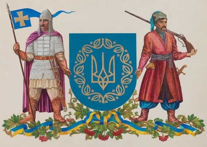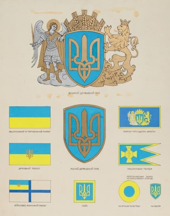 Основна концепція герба полягала в тому, що ми відновлюємо нашу державність. І Україна виникла не з нуля у 1991-1992 роках, а відновлює свою державність ще з 1918 року, коли було проголошено Четвертим Універсалом незалежність УНР. Ми запропонували тоді Великий Герб, на той час це була диковинка. Не зовсім стандартне рішення, бо Радянський союз і УРСР мали по одному гербу. Наш Великий Герб зображав два щитотримачі – давньоруський ратник та козак з мушкетом. Під щитом була декоративна гілка з калиновим листям, перешита синьо-жовтою стрічкою.