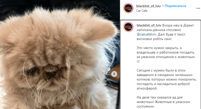 Кілька днів тому сталася ситуація, коли одна з відвідувачок закладу «Cat Cafe», що на вулиці Генерала Григоренка, 1а у Львові поскаржилася на те, що тварини в жахливому стані. Жінка написала допис в одну з груп у мережі, додавши фото двох котів. Вона стверджує, що тварини хворі, в них проблеми з очима, збита шерсть і, до того ж, тікають від людей.