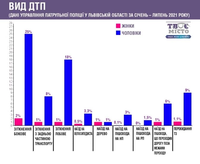 Залежно від механізму вчинення ДТП патрульна поліція виділяє низку видів, як-от: зіткнення, перекидання, наїзд на нерухомий транспортний засіб або перешкоду, наїзд на пішохода, велосипедиста, гужовий транспорт, наїзд на тварин тощо. Цікаво, що водії, і чоловіки, і жінки, найчастіше створюють аварійні ситуації внаслідок бокового зіткнення. Також чоловіки-водії потрапляють в аварію внаслідок лобового зіткнення, перекидання транспортного засобу та наїзду на пішохода, що переходив дорогу поза межами переходу. Водійки ж, окрім бокового зіткнення, наїжджають на перешкоди та теж створюють аварійну ситуацію через перекидання автівки.