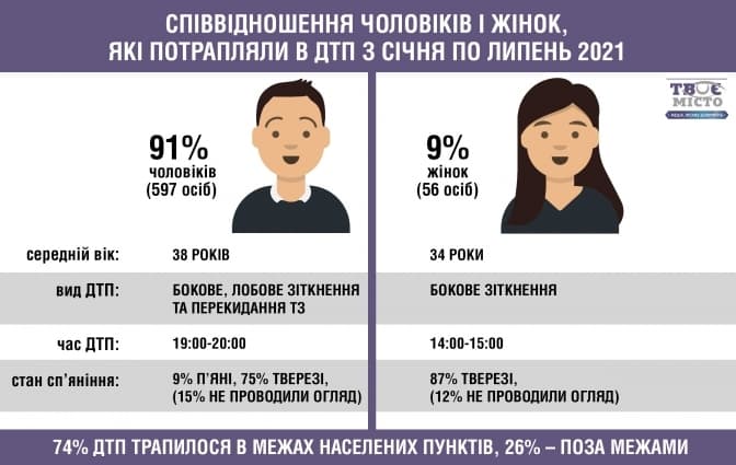 Проаналізувавши дані управління патрульної поліції у Львівській області про ДТП, які трапилися в регіоні протягом січня – липня 2021 року, Tvoemisto.tv вирішило зробити свій портрет типового водія-учасника аварії. Так, чоловіки тут переважають – 91% (597) водіїв – проти 9% (56) жінок-водійок. Водночас, як повідомили у регіональному сервісному центрі ГСЦ МВС у Львівській області у відповіді на запит Tvoemisto.tv, за період з 2017 по вересень 2021 року на чоловіків зареєстрували 363 711 транспортних засобів, а на жінок майже втричі менше – 131 002 автомобілів.