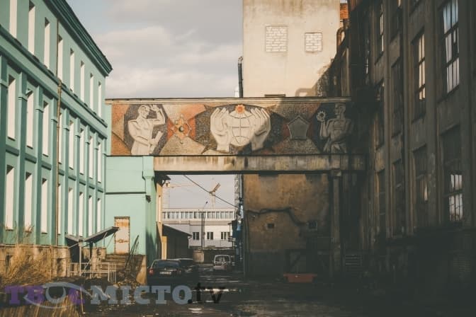 Проте, якщо раптом Вам пощастило потрапити за перепин у справах,чи просто так, то перше, що впадає в око, коли ви йтимете вглиб ділянки – барвиста мозаїка, викладена на галереї між двома цехами заводу.