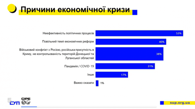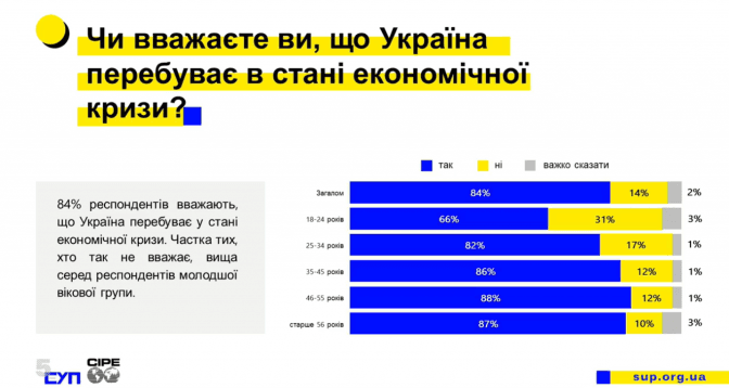Спілка українських підприємців у партнерстві із Центром міжнародного приватного підприємництва (CIPE) провели масштабне дослідження уявлень населення про темп впровадження економічних реформ та перешкод для їхньої реалізації. Провівши опитування серед 1000 респондентів і 15 фокус-групових дискусій, вдалося визначити, що 84% українців вважають: Україна перебуває у стані економічної кризи, а частина з респондентів, які не поділяють цієї думки, вища серед представників молодшої вікової групи.