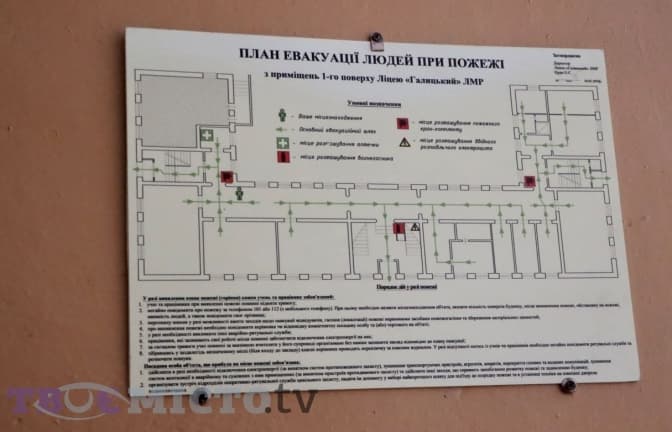 У ліцеї «Галицький», що на вул. Замковій, навчається не так багато дітей – 380. У підвальному приміщенні навчального закладу є укриття. На це вказують стрілочки, які розташовані по цілому ліцеї. Крім того, в коридорах на кожному поверсі розміщені плани евакуації, які, до слова, світяться у темноті.