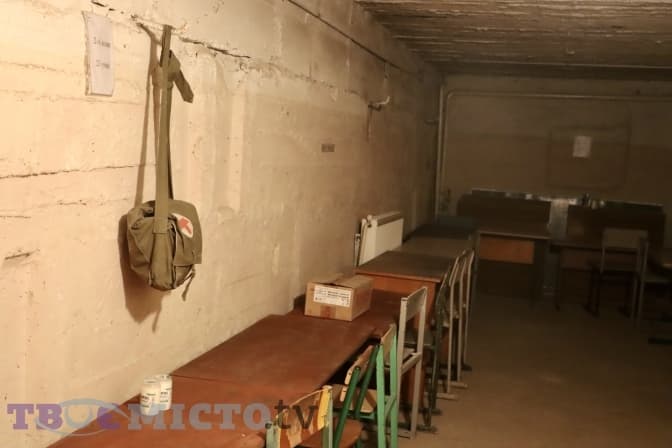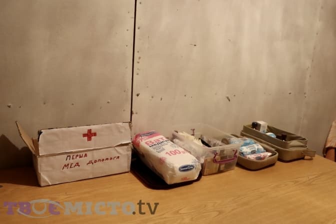 На стінах розвішені наліпки, який клас саме тут зможе «осісти». Також висять медичні сумки. Там медикаментів небагато – бинт, вата, пластир, джгут. Завідувачка з господарської частини запевняє, що у кабінеті медичної сестри є все необхідне і навіть із запасами. У разі потреби все перенесуть сюди. Також аптечки мають на прохідній, заступники директора та класні керівники.