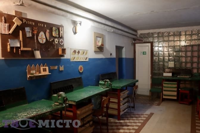 Підвальне приміщення просторе. При вході справа стоять столи шкільних майстрів. Прохід вільний, розчищений. Всередині доволі широкі коридори, в яких по два боки розмістили парти зі стільцями. Директорка каже, що ці парти хороші, якісні і навіть не дуже старі. Оскільки школа щоразу отримує новий інвентар та парти, ці виносять сюди.