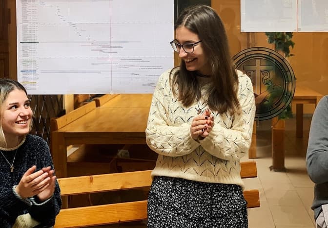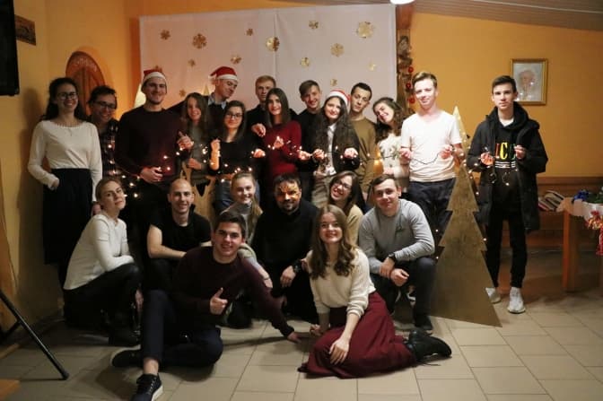 Мене зустрічає маленька дівчина із прямим довгим волоссям. Вона відволікається у процесі обв’язування зігнутих гілок туї для святкового вінка. Це моя давня знайома, Юстина Підгребельна. Завдяки їй я свого часу і познайомився із францисканською молоддю. Ми разом з нею із з ще декількома членами ФМ були на зустрічі з Папою Франциском у Будапешті. Тоді ми всі пішки пройшли біля 30 кілометрів по місту і ночували в спортивному залі школи на матах.