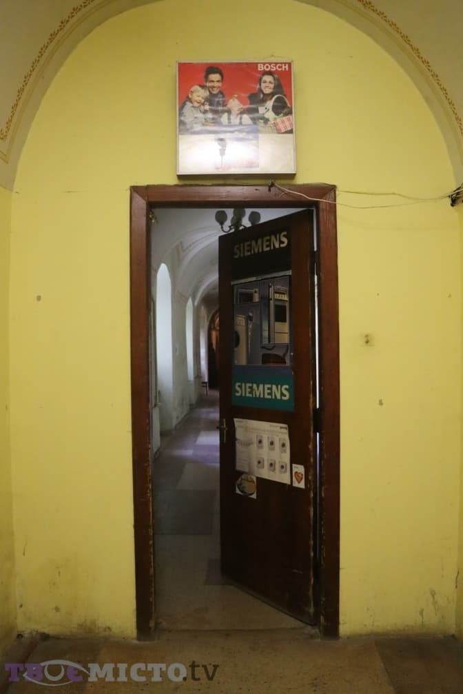 Коридор розгалужується. Ліворуч – броньовані двері, за якими рай на Землі, каплиця Розена. Нею опікується римо-католицький Домініканський орден. Про цю каплицю вже писало Tvoemisto.tv. Прямо – дорога до державного підприємства «Система», 25% приміщень якого нещодавно передали Римо-католицькій церкві, а 75% і далі перебувають у державній власності. Тут мене зустрічають занедбані МАФи з опущеними ролетами, побиті вікна, різні знищені часом і людьми радянські меблі та інший непотріб у коридорі.