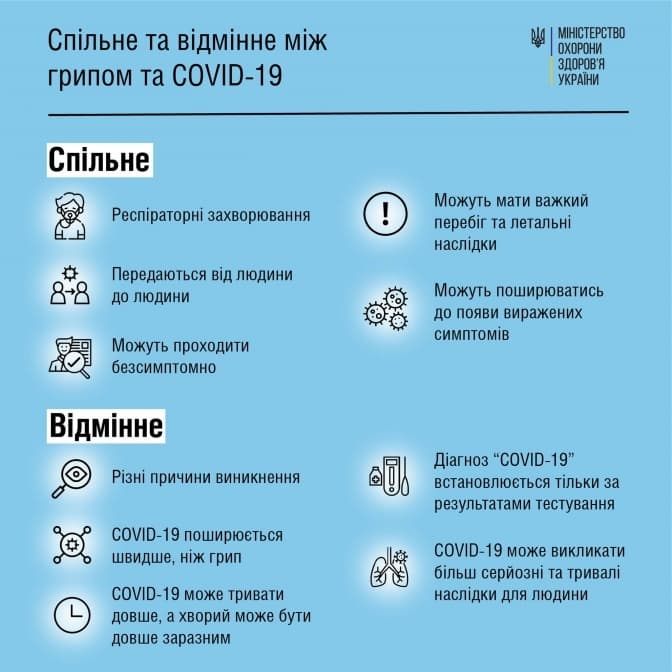 За останньою інформацією МОЗ, Covid-19 поширюється легше, ніж грип. Як грип, так і коронавірусна інфекція можуть передаватись від людини до людини, які перебувають поруч, не дотримуючись дистанції. Людина, інфікована Covid-19, може мати довший безсимптомний період і може бути заразною для інших також довше.