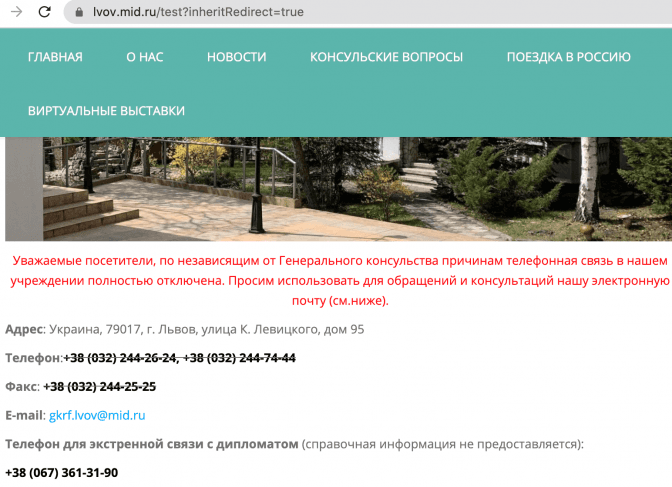 Ця дипломатична установа розташована недалеко від середмістя, на вул. Костя Левицького, 95. Минулого тижня на її сайті з’явилося повідомлення про те, що в Генконсульстві РФ із невідомих причин повністю вимкнений телефонний зв’язок. Активним мав би залишатися тільки номер екстреного зв’язку з дипломатом, але й він не відповідає.