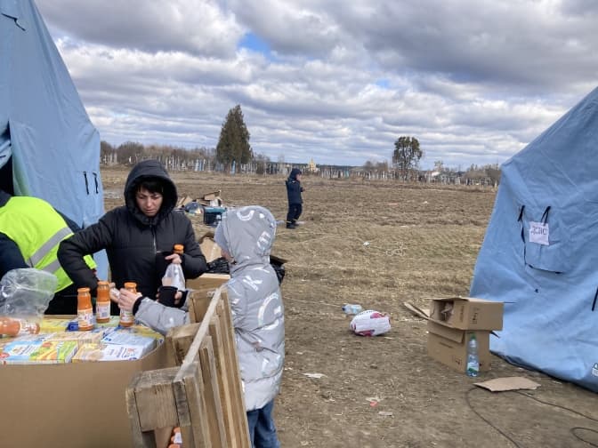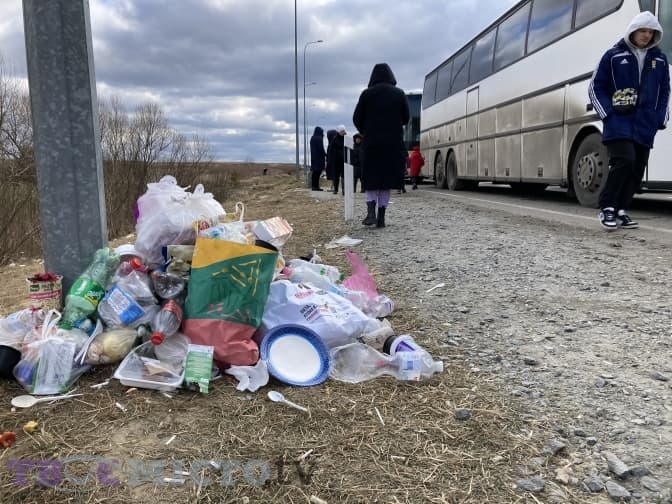 Неподалік від самого пункту пропуску розкинули великий білий намет. До нього кілька десятків людей у черзі. Тут роздають їжу, тут можна зігрітися, взяти гарячу воду для чаю або дитячої суміші. Також є декілька біотуалетів. Але їх не вистачає, тож люди ходять на узбіччя вздовж дороги, і там сморід.