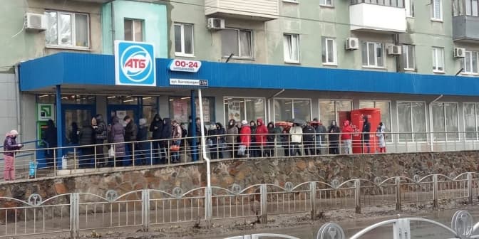 З усього цього залишився тільки один супермаркет, який пропрацював ще якийсь час. Може, тиждень, може, півтора. Я не знаю як, але його власнику вдалося домовитися з теробороною, і вона той супермаркет охороняла. Біля нього шикувалися люди у величезну чергу, по шість-вісім годин стояли, щоби щось купити. Асортимент був, скажімо так, бідненький: залишилося те, чого ніхто не купував. А от хліба і води годі було знайти.