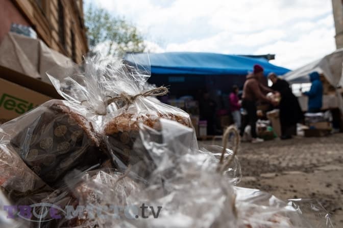 Подвір’я, де розташувався осередок Львівської волонтерської кухні, ущент заставлене картонними ящиками, коробками і великодніми пасками. Це місце переповнюють розмови, вказівки-вигуки, шурхіт поліетиленової плівки, шкребіт ножів, пориви вітру і звуки розмотування скотчу, яким обгортають коробки.