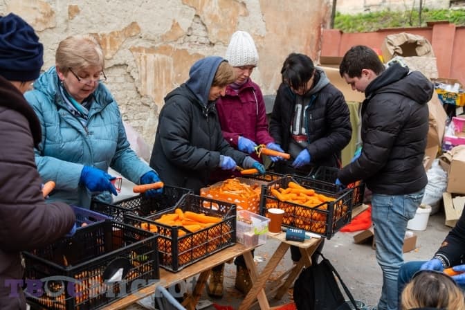 Поки волонтерів десятеро чистять моркву, дві студентки Академії українського лідерства пакують паски, а троє чоловіків переносять коробки з обрядовим хлібом в інший куток двору.