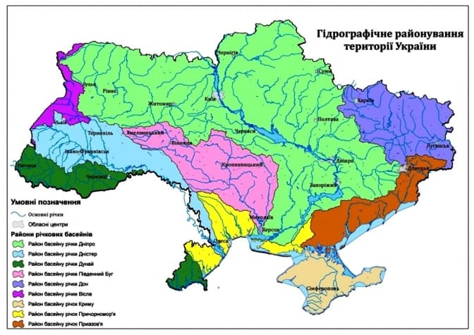 Картосхема гідрографічного районування території України. На картосхемі видно, що Львівська область входить до басейну трьох великих рік: Дніпра, Дністра і Вісли.