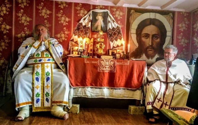 Отці Август Чумаков та Михайло Димид під час Літургії на Кінбурнській косі, Миколаївська область