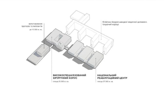 З її слів, саме за стільки часу може постати окремий корпус реабілітаційного центру, який планують звести між лікарнями Святих Пантелеймона і Миколая. Тут запрацюють відділення реконструктивної хірургії, ортопедії, психологічної, психосоціальної та фізичної реабілітації, а також опікової травми, 3D-друку кісткових імплантатів і «Майстерні протезів». В центрі ставитимуть кісткові біоімплантати й екзоскелети, робитимуть реконструктивні операції на кінцівках і мікрохірургію кисті, ендопротезування.
