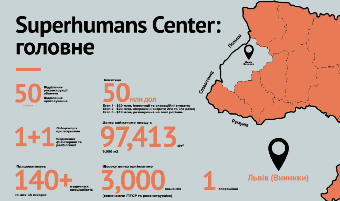 «Superhumans планує прийняти перших пацієнтів уже навесні 2023 року. Зараз починаємо реконструкцію частини госпіталю ветеранів, яку надала Львівська обласна рада для створення центру протезування, психологічної підтримки, реконструктивної хірургії та реабілітації. Перші роботи з демонтажу почнуться уже тепер, в жовтні. Загальна вартість створення й функціонування центру на перші три роки становить 50 мільйонів доларів», – каже вона.
