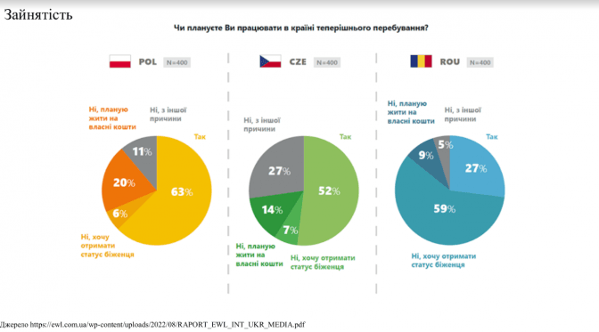Відповідне дослідження провели у трьох країнах – Польщі, Чехії, Румунії. Найбільше людей, які орієнтовані на те, щоб працювати і заробляти гроші – у Польщі. Трохи нижчий відсоток – у Чехії. Найбільше людей, які хочуть отримати статус біженців – у Румунії.