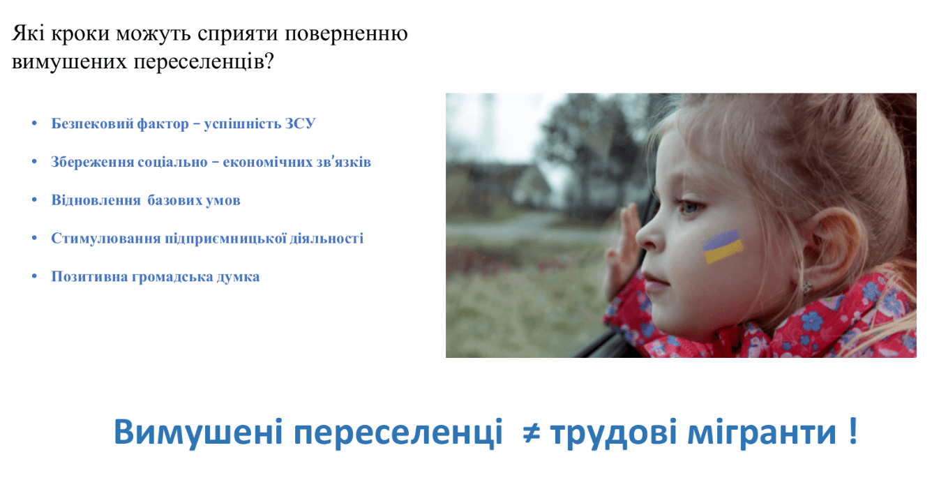 Також потрібно відновлювати базові умови – житло, надання послуг, котрі може надавати держава чи місто. Вони є особливо важливі у зруйнованих регіонах. Як тільки ці умови будуть покращуватися, то люди будуть повертатися.
