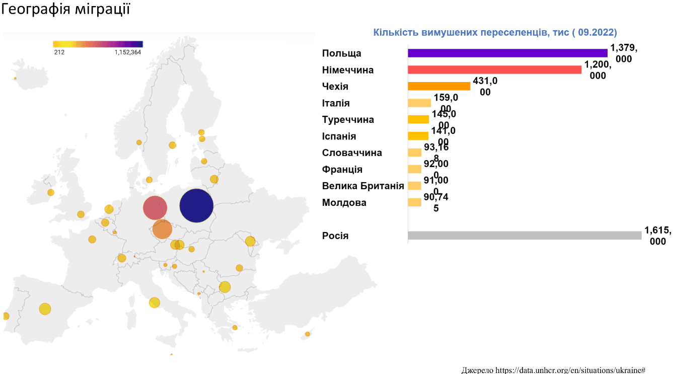 У таблиці – дані станом на вересень по десяти країнах-лідерах, де найбільше українських переселенців. Зокрема, про тих, хто зареєструвався, а не шукав притулку як біженець. У кожній країні цифри різні, вони змінюються дуже гнучко. Лідерами є найближчі до нас країни – Польща і Чехія. В Німеччині кількість людей збільшилася з 900 тисяч до 1,2 млн лише за літній період. Не виключено, що ці люди були попередньо зареєстровані в інших країнах, але здійснили переїзд.