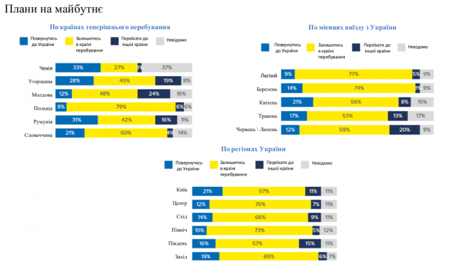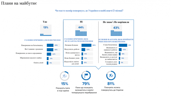 Є 80% людей, котрі планують залишатися у країні перебування. З них 81% сказали, що вони планують повернутися в Україну, але невідомо, коли саме.