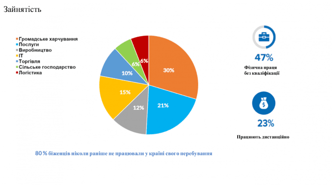 64% були працевлаштовані в Україні до того, як виїхали, а станом на зараз працюють лише 28% (це разом з людьми, які працюють в країні, куди переїхали, так і люди, які працюють в Україні дистанційно).