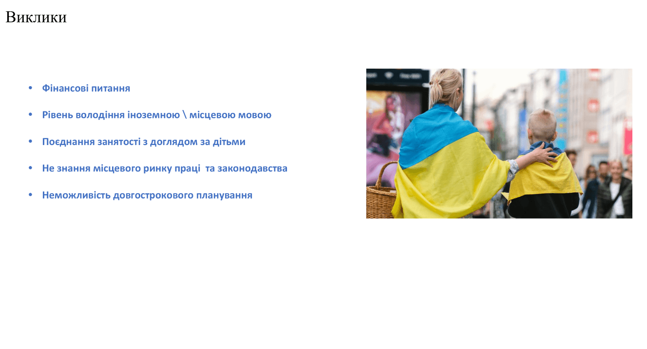 Наступне, що заважає людям знайти рбооту, – незнання місцевого ринку праці і законодавства. Люди можуть бути фахівцями високого рівня, але не маючи досвіду роботи за кордоном, (80% людей, котрі переїхали за кордон, ніколи не працювали в країні, куди переїхали і загалом за кордоном. Тобто це люди, які не були налаштовані на трудову міграцію, вони тікали від війни) часом можуть знайти або нелегальну рбооту, або потрапити на не дуже совісних роботодавців.