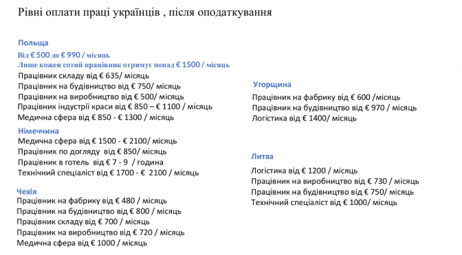 Також у Литві українці можуть отримувати від 1200 євро у місяць, працюючи у сфері логістики, від 1000 євро можуть отримувати технічні спеціалісти. Найменше отримують працівники на виробництві – від 730 євро у місяць, та працівники на будівництво – від 750 євро у місяць.