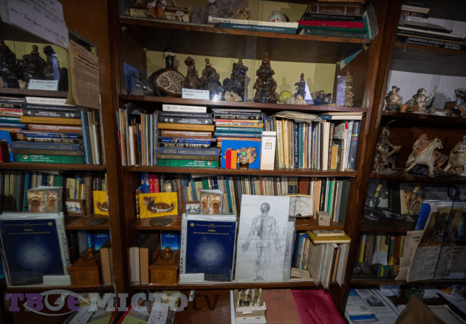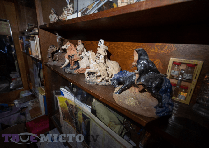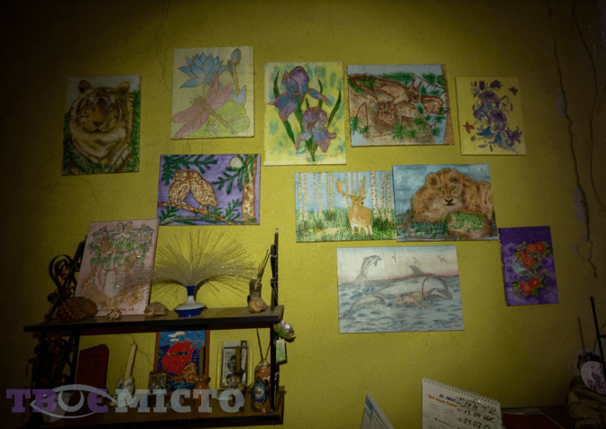 Жінка спостерігає за нашим фотографом і запрошує глянути на картини, що висять на стінах, на речі в серванті. Тут те, що миле її серцю. Зверху під склом – керамічні вироби, створені нею в гончарній майстерні: сови, собаки, інші тварини. У них можна подавати напої.