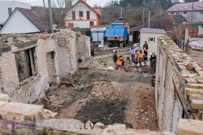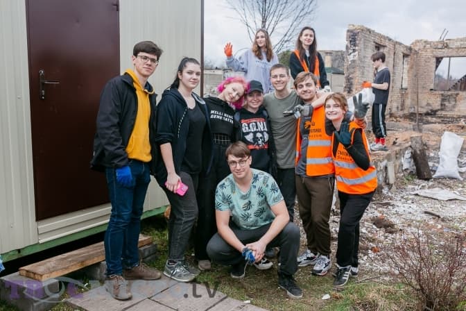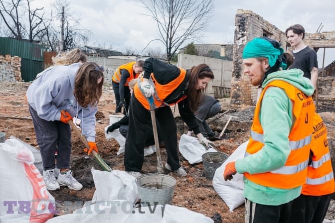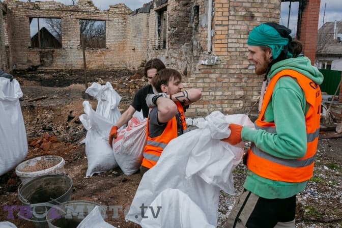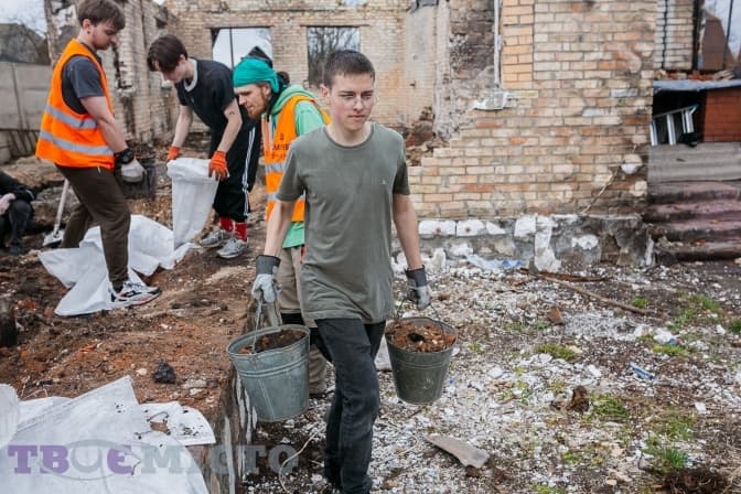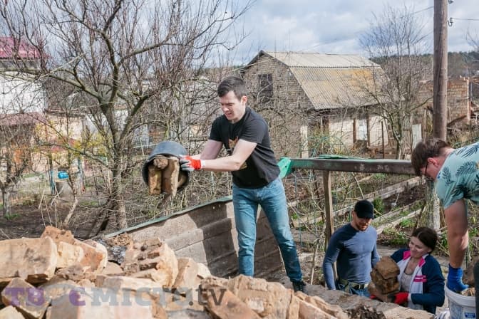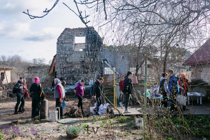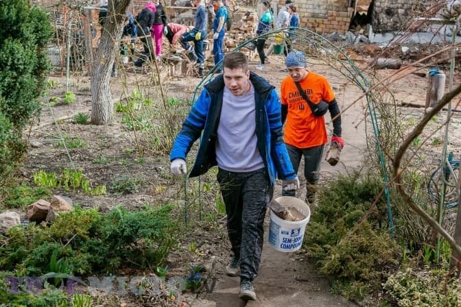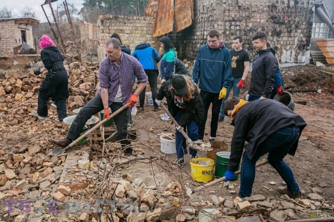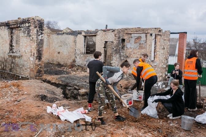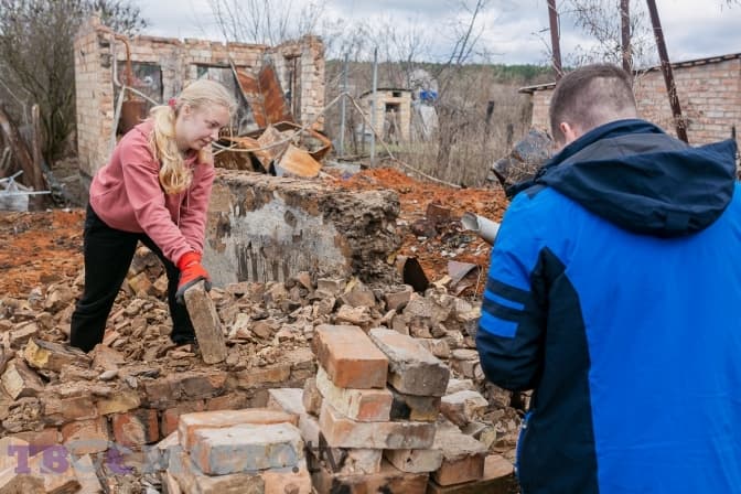 Майже 30 молодих людей діляться на дві групи і йдуть на різні точки. У дворі Світлани Михайлівни один із будинків залишився неушкодженим, від другого зосталася лиш обгоріла стіна, купа цегли й металу.