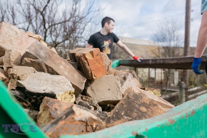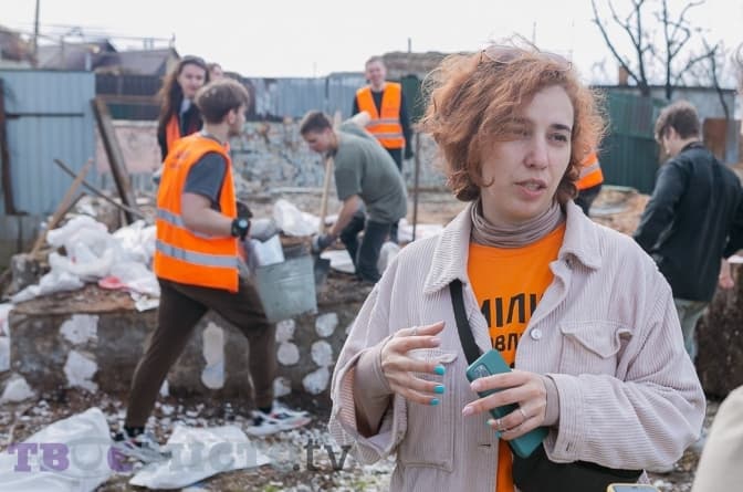 Поки ми з нею спілкуємося, волонтери розгрібають залишки цегли, складають її у відра та висипають у кузов вантажного автомобіля, із якого долинають пісні «Океану Ельзи», «Мандрів», Lany Del Rey.