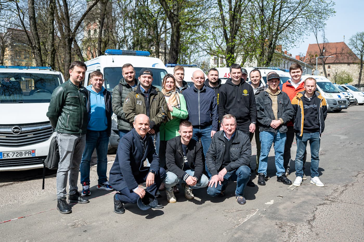 Заступник голови Львівської ОВА, співзасновники SoftServe та представниця БФ «Відкриті очі» під час передачі карет «швидких» на передову
