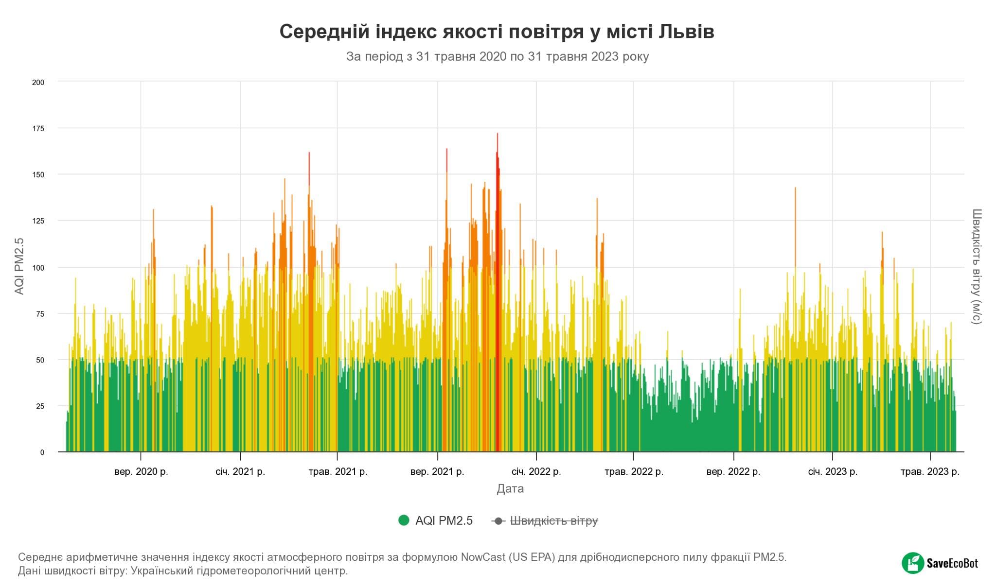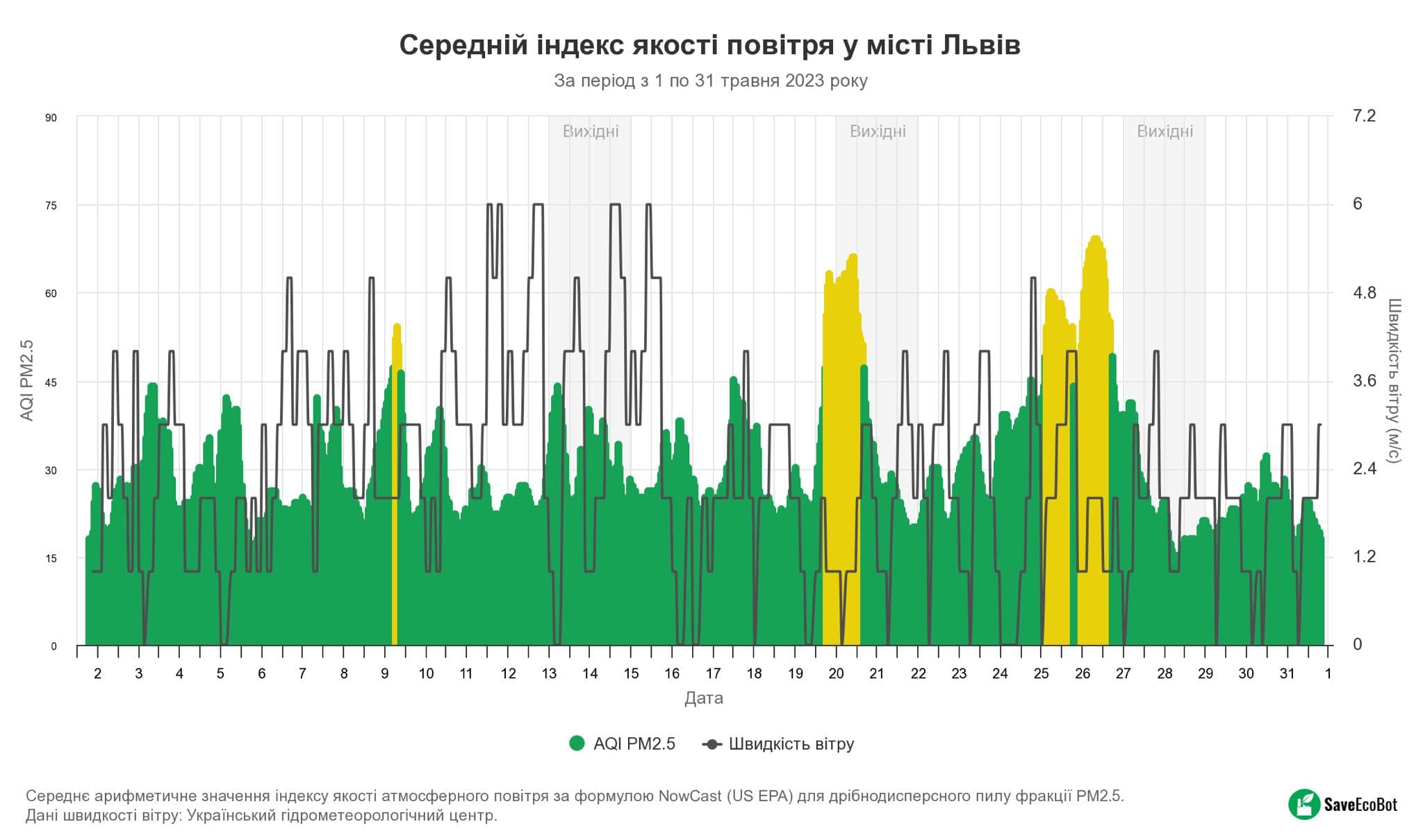«У Львові показники переважно в нормі. У випадках різкого погіршення стану повітря є рекомендації, щоби не їсти надворі, рідше перебувати на вулиці через раптове забруднення. Я не можу пояснити, чим це спричинене за ніч, але, ймовірно, через кліматичні або погодні зміни», – каже науковиця і додає, що на SaveEcoBot якість повітря в місті вимірюють за показником PM 2.5. Він позначає дрібнодисперсні речовини, що є часточками забруднення з діаметром менш ніж 2,5 мікрометра. Ці елементи можуть потрапляти в легені, кров і навантажувати серцево-судинну систему.