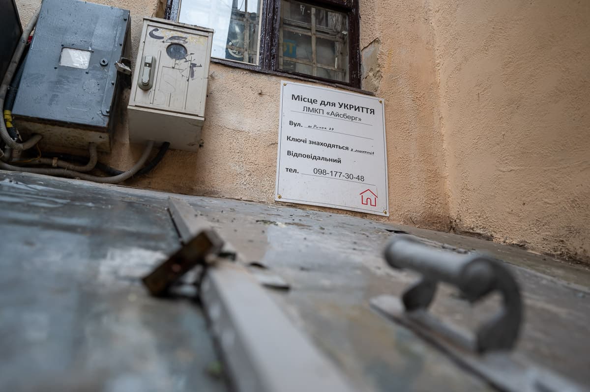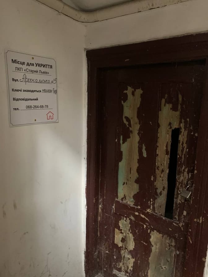 Там, у під’їзді, крім замка на майже розбитих дверях і таблички з номером телефону, ми нічого не побачили. Зателефонувавши на вказаний номер (приймальня ЛКП «Старий Львів»), спробували дізнатися про те, чому під час тривоги на дверях укриття висить замок. Нам відповіли, що зараз перетелефонують і все залагодять.